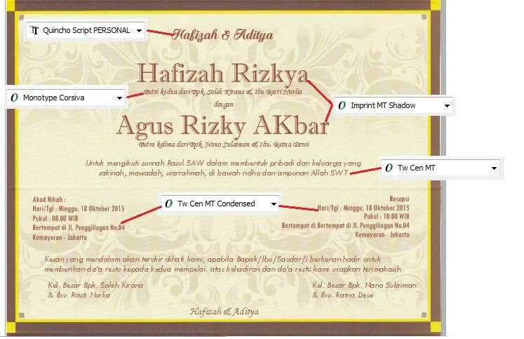 Dan untuk teks lainya saya menggunakan font Monotype Corsiva. Font ini sudah ada di komputer, jadi tidak perlu sobat download lagi. Warna fontnya saya menggunakan warna Ruby Red dan warma custome C : 65 M : 89 Y : 90 K : 28.